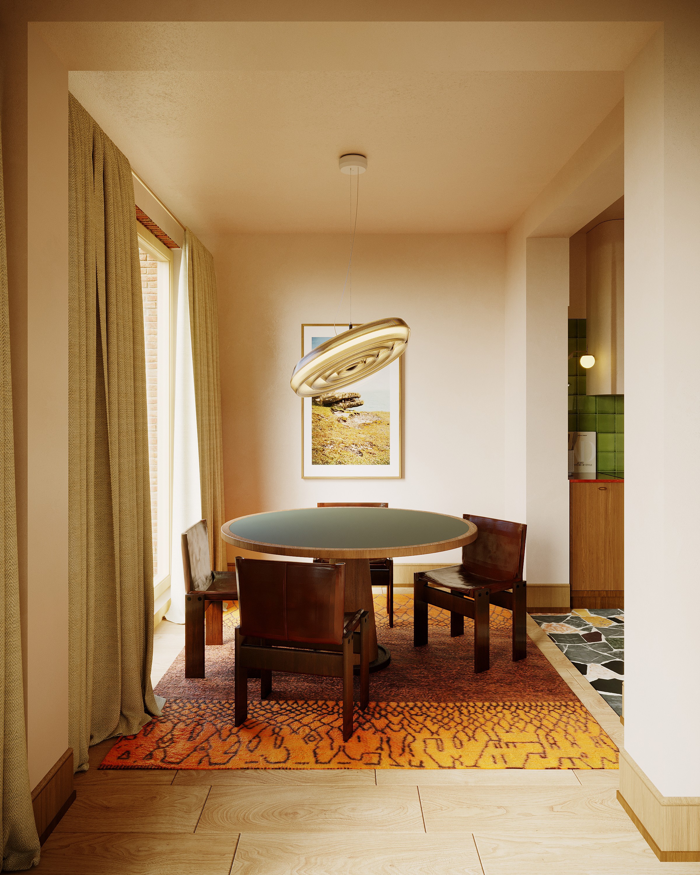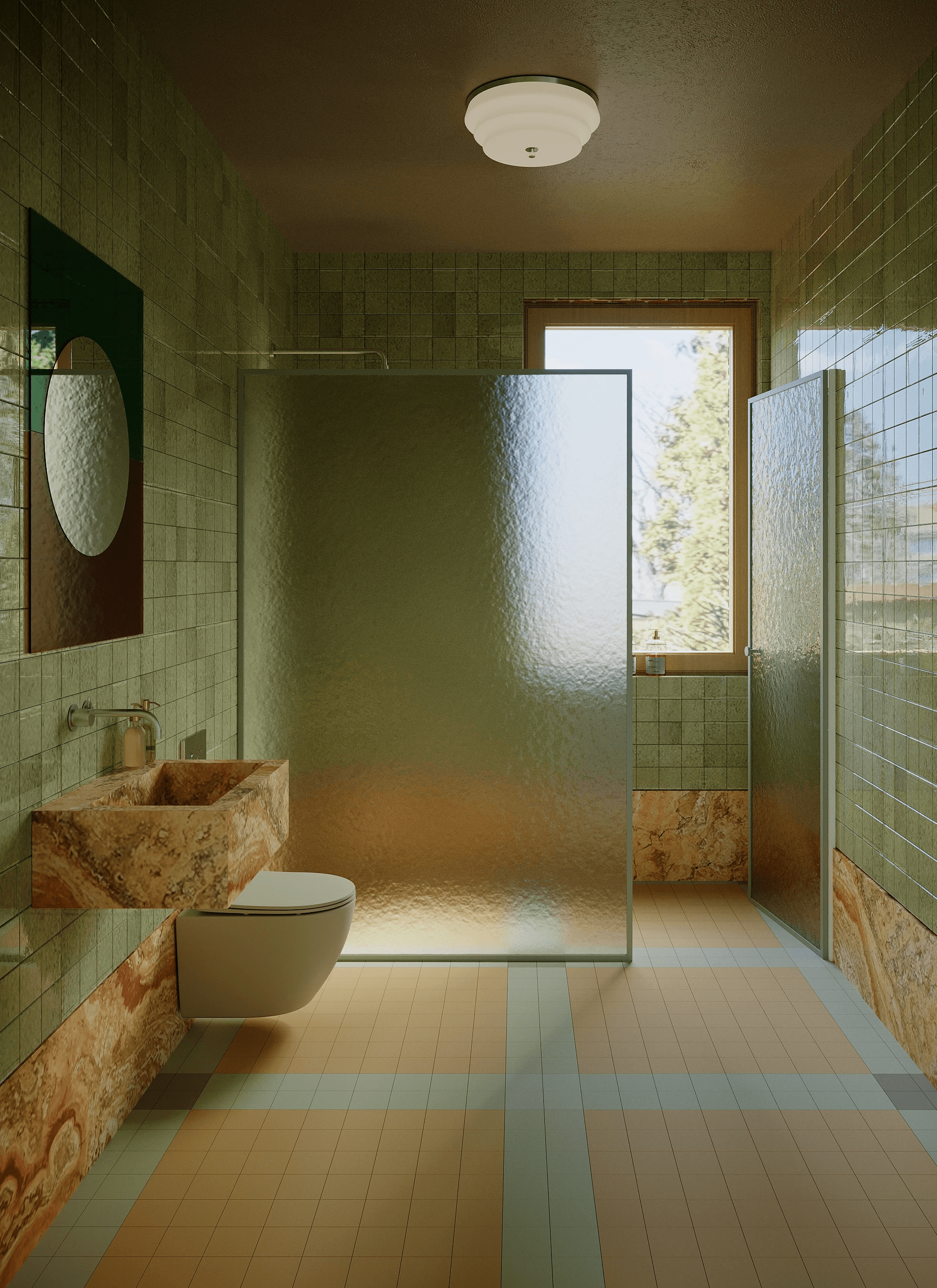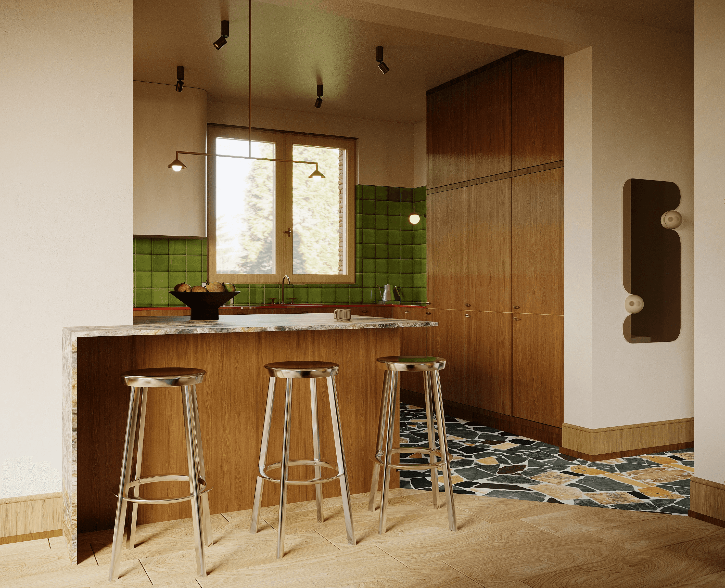 A comprehensive renovation of a 1970s house, transforming a dated chalet into a contemporary family home for three. This project reimagines the original interior structure while honouring its architectural bones, creating spaces that balance warmth with modern sophistication. The design language throughout draws from the natural surroundings, incorporating rich materiality - green glazed tiles, variegated marble and travertine, warm wood paneling, and custom terrazzo flooring. Key interventions include opening up the main living spaces to maximise natural light, custom millwork throughout, and carefully curated material palettes that feel both timeless and distinctly contemporary. The result is a home that feels both grounded in its nature setting and collected - a space that supports family life while maintaining a refined sensibility for a family with strong appreciation for art and craftsmanship.